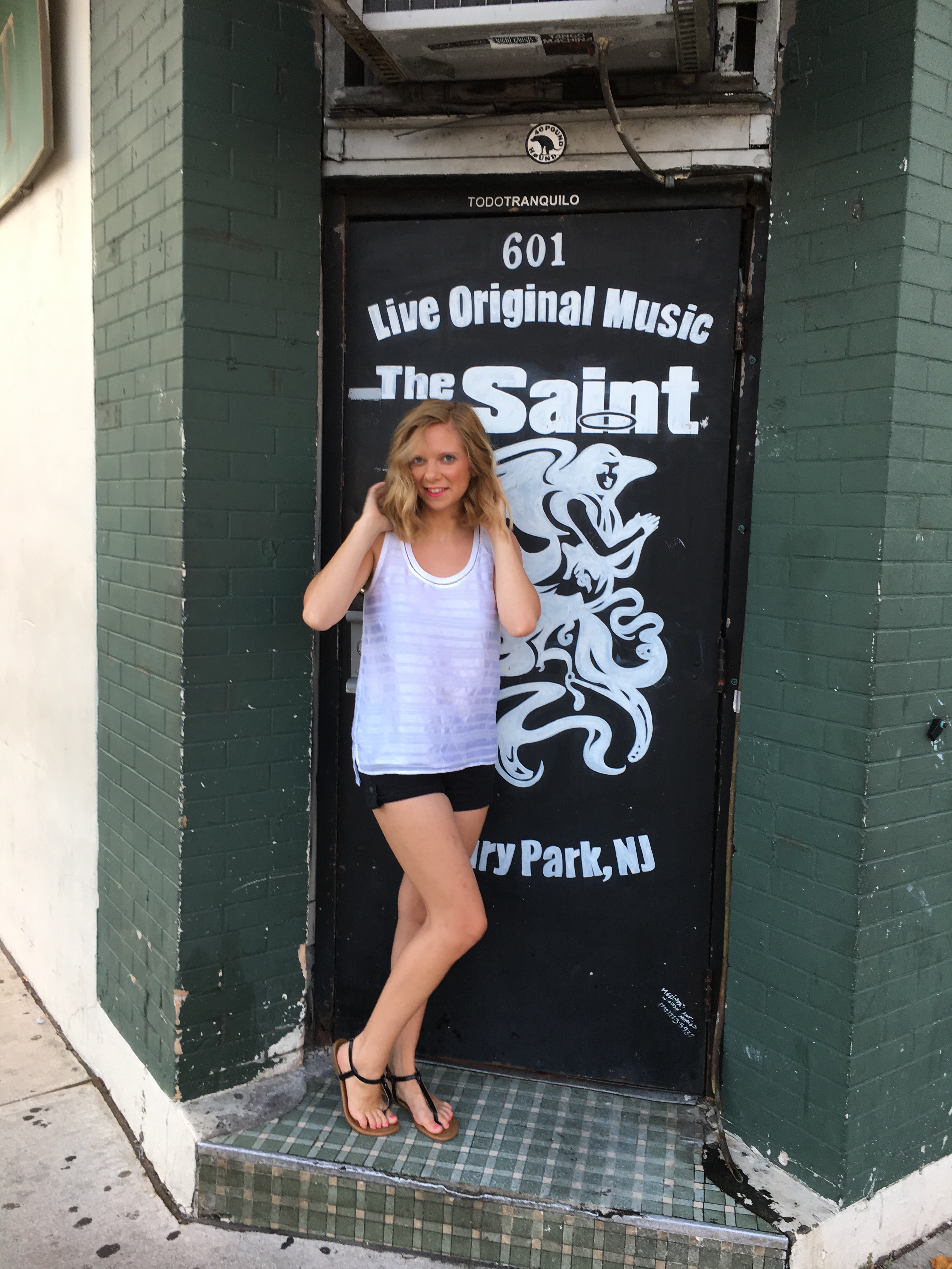 On Thursday evening my dad had a “gig” at the famous venue, The Saint in Asbury Park. After work I ran home to quickly change out of my work outfit and throw on something concert appropriate. I paired black shorts with a white satin scoop neck sheer tank. I added some curls to my hair and with a hot pink lip it looks like I am actually getting enough sleep during the week!