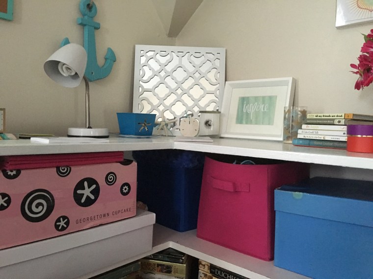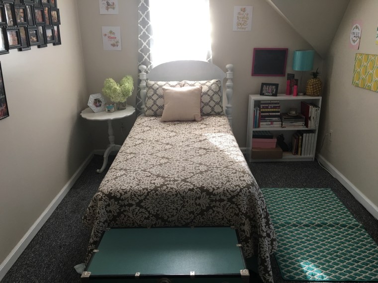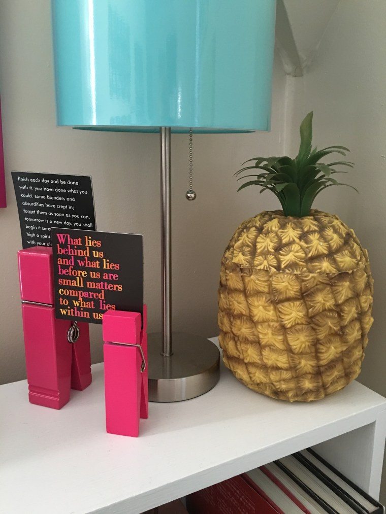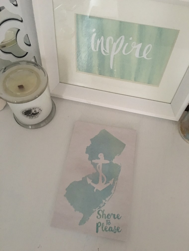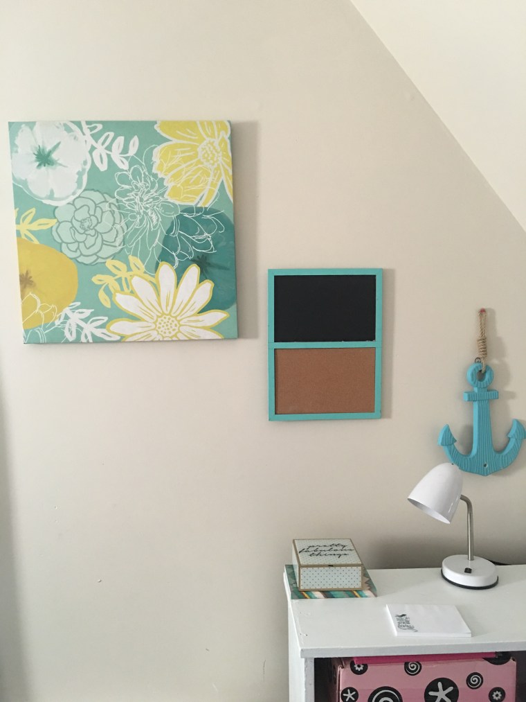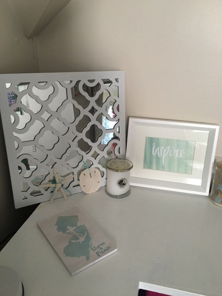 When designing a room it’s best to make a theme and a color palette. My senior year room color had a blue beachy theme and I was able to use the room decor again and purchase a few items from Target and Home Goods to improve the space. Most of the items in my room were from HomeGoods found in the clearance section for just a few dollars (or pennies!).