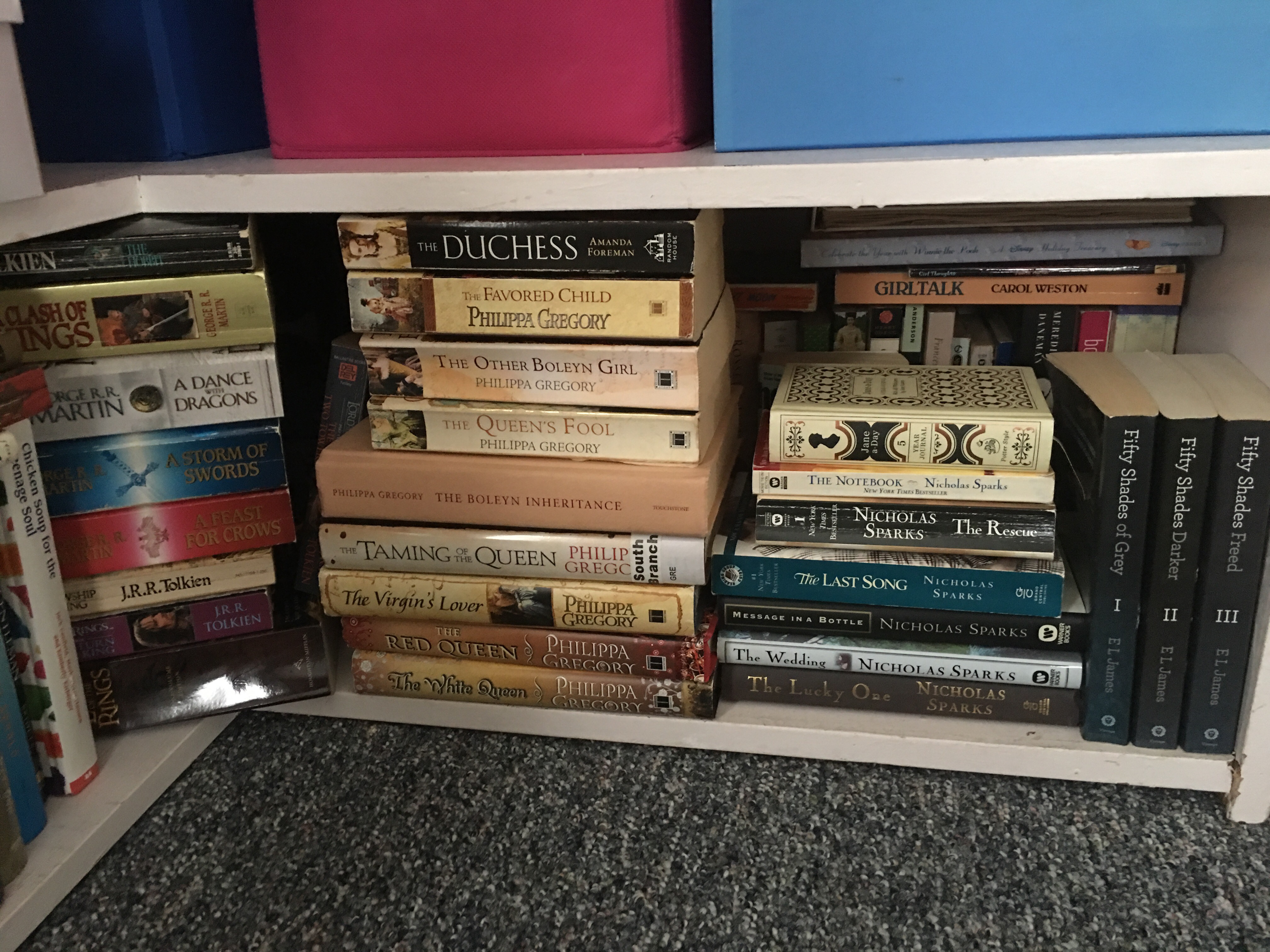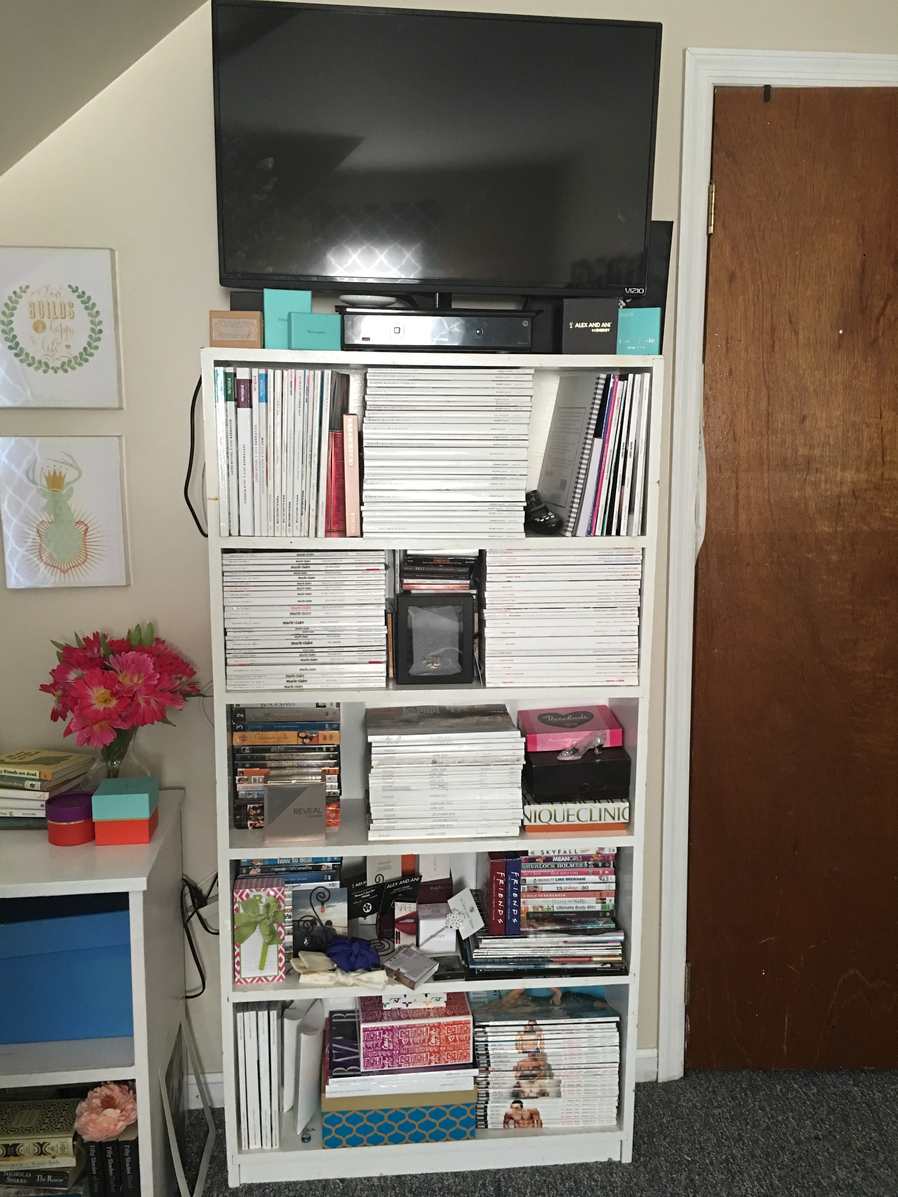 My closets have zero storage and are very tiny, making it difficult to store shoes. Now all of them fit in the blue trunk. It was given to me as a present and has been a big lifesaver. If the shoe doesn’t fit in the trunk, it’s time to throw out some shoes. I have become very committed to purging everything in my life. I’ve had the bookcases since before I was born! They were originally built ins for my parents living room in a house they had before I was born. They’ve stayed with me since they were in my baby room and with a new fresh coat of paint, they are good as new!