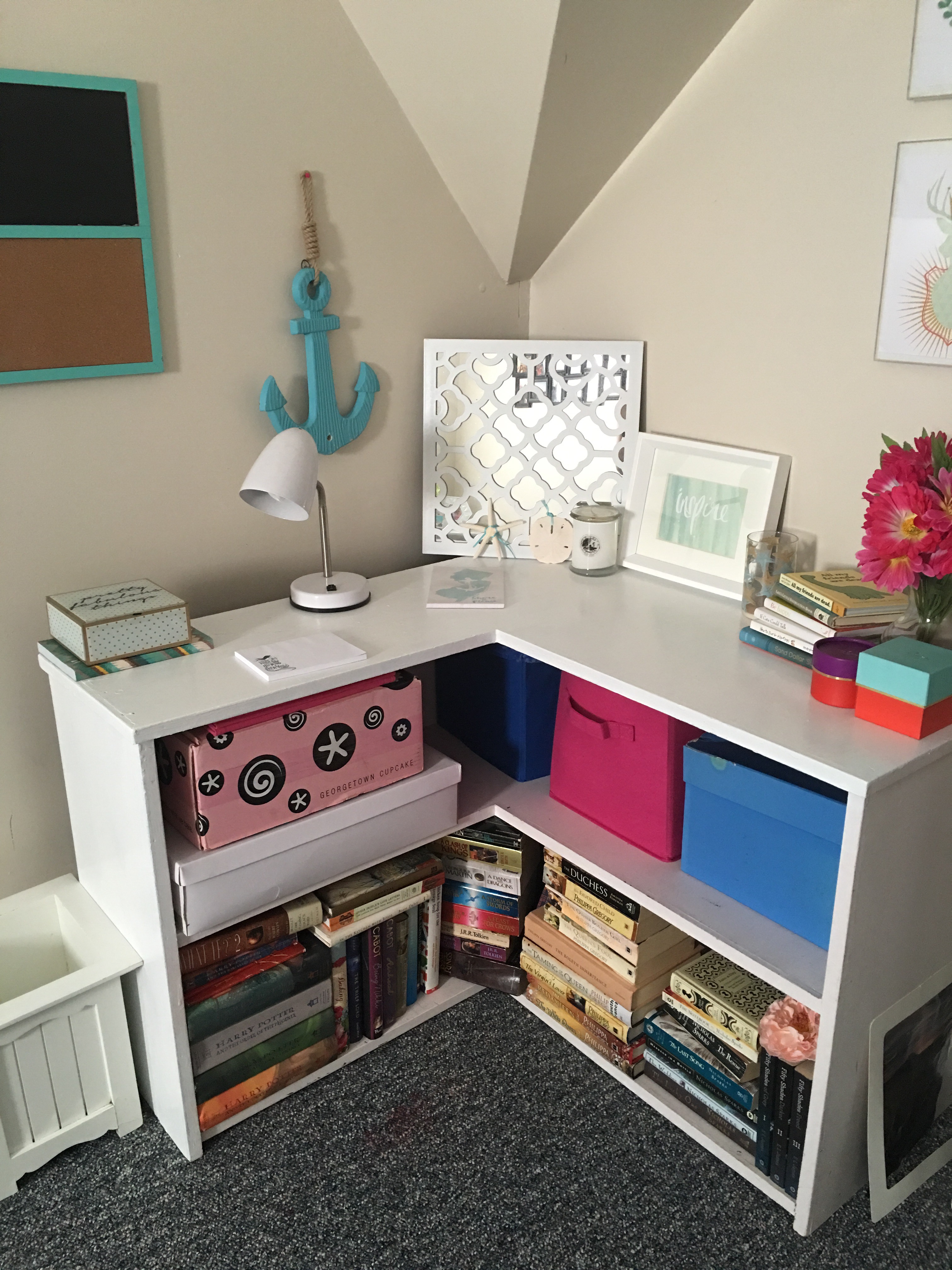 When designing a room it’s best to make a theme and a color palette. My senior year room color had a blue beachy theme and I was able to use the room decor again and purchase a few items from Target and Home Goods to improve the space. Most of the items in my room were from HomeGoods found in the clearance section for just a few dollars (or pennies!).
