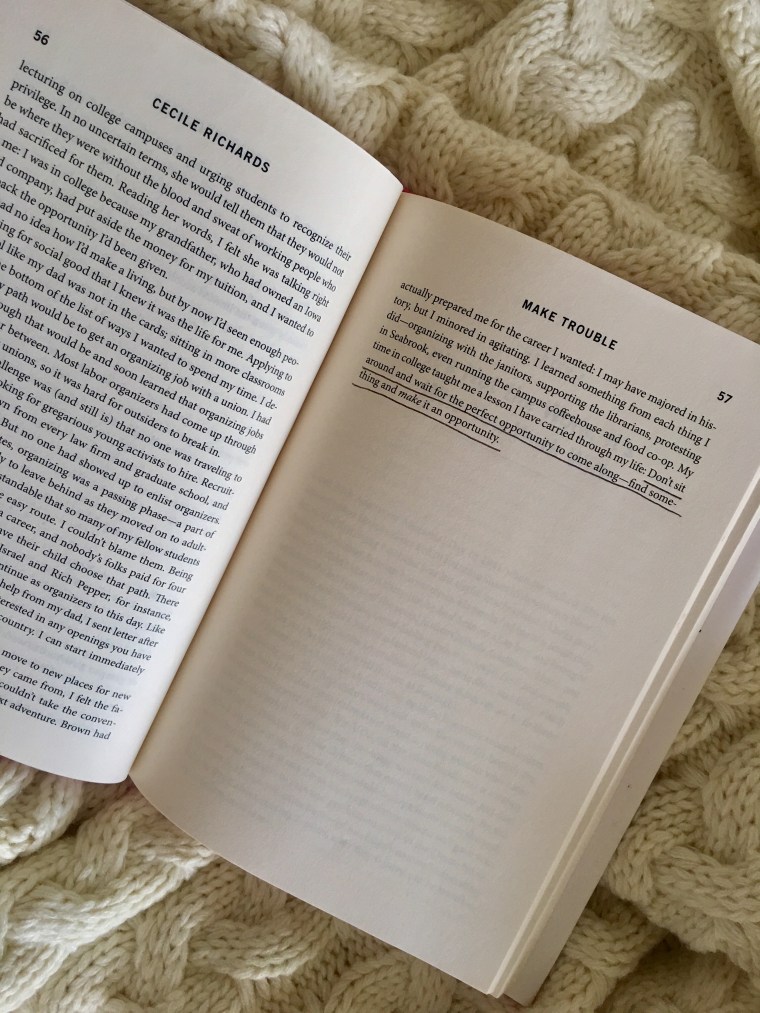 I was at Costco a few weeks ago and I always have to browse the books every time I visit. I have dozens of books sitting on my bookcase waiting to be read, but I can’t help myself buy new books each time I go. I had heard that Cecile Richards had written a book recently, but didn’t hear much else about it. For a woman who has done so much about women’s rights and someone I admire, I realized that I actually know very little about her. I didn’t need another book – and when would I have time to read during this moving process? However, I had to buy it because for a woman who has gone through so much public scrutiny and had to testify for Planned Parenthood, which resulted in an hours-long battle of trying to defend why women should have access to health care. I wanted her book sales to go up, sounds silly I know, but it’s not like I could call her and say thank you for standing up for my rights. A book purchase was the least I could do. I don’t often write in books, but after the first few pages, I found myself underlining key sentences that I knew I would want to go back to. I am only a few chapters in, I treat myself on my lunch break at work and read a few pages when I can – but I cannot help myself nodding in agreement, getting inspired and just wanting to passionately say YES! on each page I read. If you don’t know her name, learn who she is. Want to change the world, but don’t know where to begin, then read Cecile’s story and learn how anyone can create change. This woman has fought for you for decades, shouldn’t you at least know the woman behind your rights?