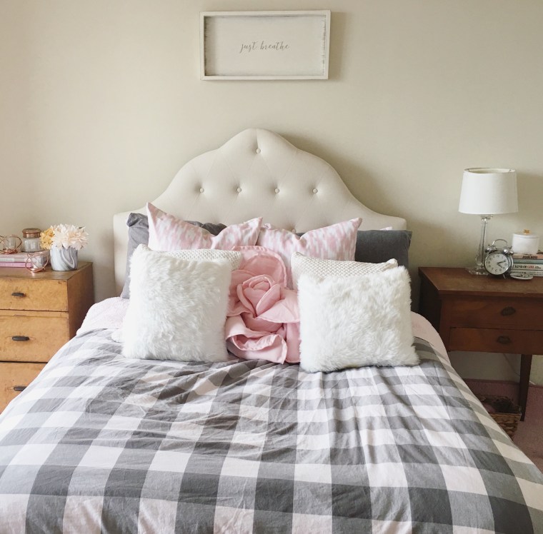 My bedroom is still in the process of being decorated and needs a few more pieces of furniture. But this is what it looked like just one day after move in. I brought my bed from home, splurged on some new decorative pillows to make it cozy. I decided on a grey and pink theme since the next time I move it will most likely be with a significant other, so this is the only time in my life when I can have a pink bedroom!