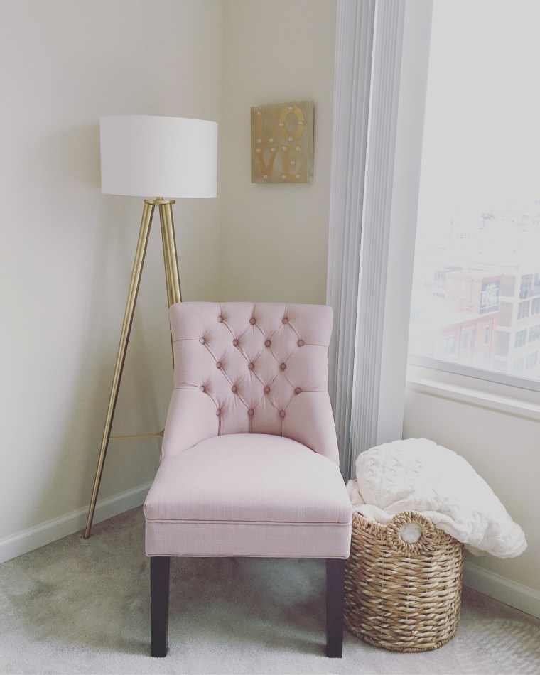 When deciding on apartment furniture, I knew I would have a very small budget when purchasing new furniture. I tried to take pieces that I already owned, but had to splurge on this lamp and chair because they make the space very homey. Even when my apartment was cluttered with boxes, just having this little space set up in the corner made it feel so cozy!