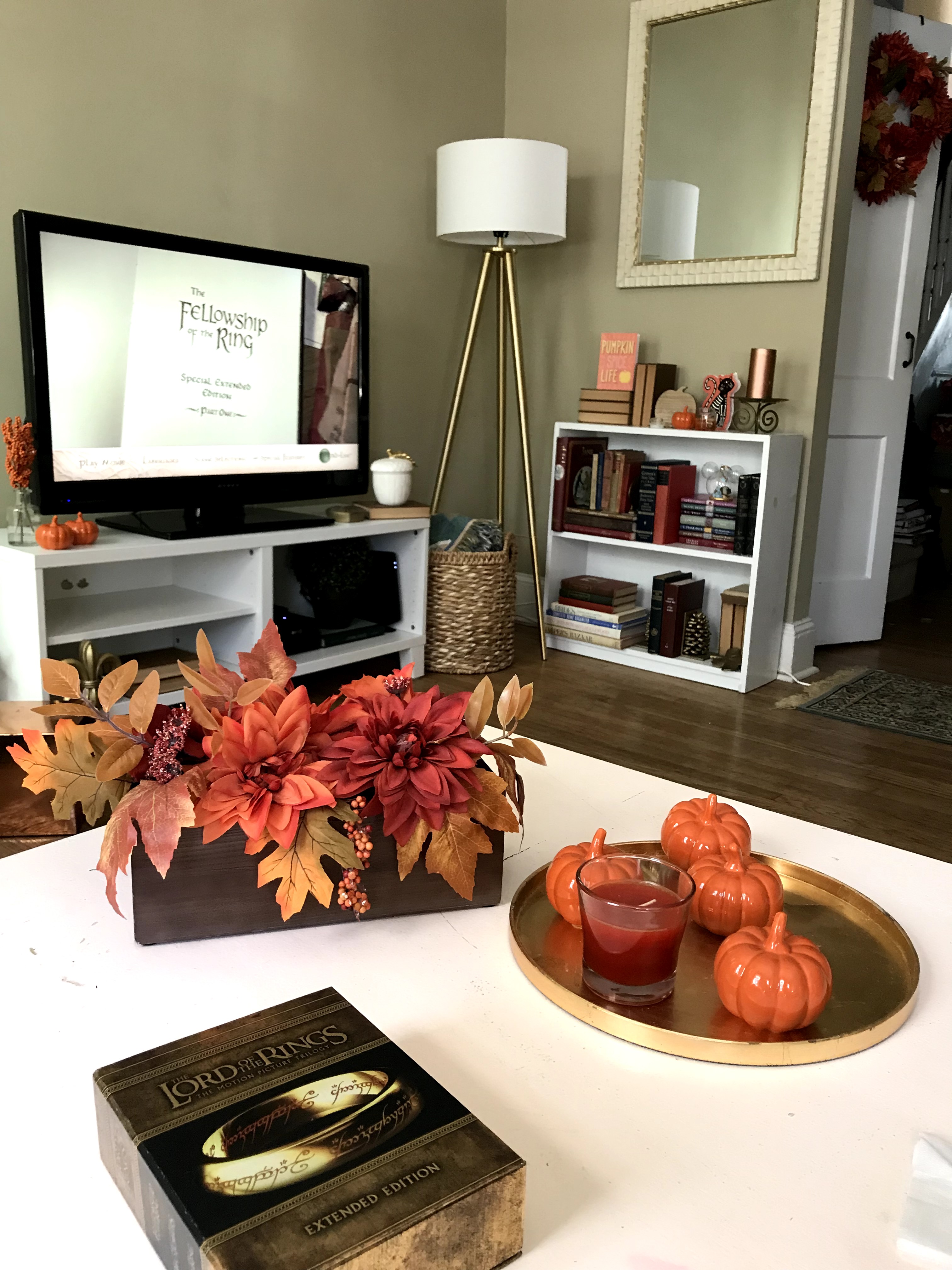 One of the most exciting things about moving into the new house is that we had a home to decorate for fall! A few weeks ago, we cleaned up a little bit to make room for some fall decor. I still want to go to Target and Homegoods to pick up a few more things but I love having my little pumpkins here and there around the house! This moving process is taking longer than I thought it would because we spent two weekends moving all of my stuff into the new house and then before we could unpack, we had to do a few (many!) trips from Jake’s apartment to the house. Gosh – we are exhausted and we are still in the moving process! On one of our trips to Lowe’s to buy a few things for the house, we also picked up mums and it brought me so much joy! We still need some pumpkins which I hope to buy this upcoming weekend but it’s so nice to home to decorate for fall! I’m just so obsessed even though our living room is once again filled with boxes and we still have so much unpacking to do. But I’m trying to find the joy in finding a home for each thing. Our weekends are spent on the couch, enjoying our home and watching lots of movies while a fall scented candle fills the house.