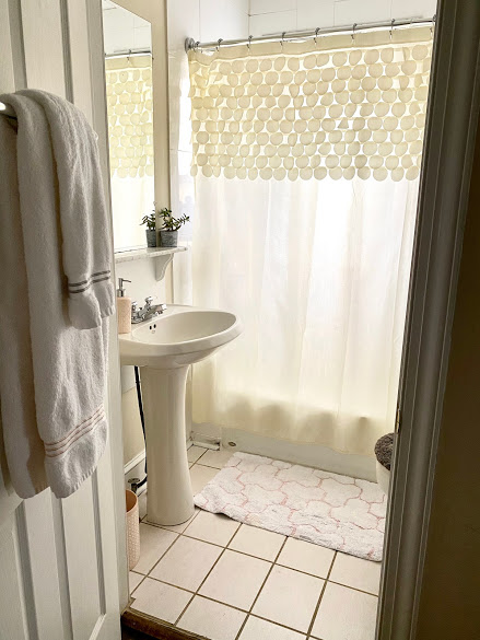 The wastebasket can be an eyesore because it’s literally a pile of trash! I splurged and got a pretty ceramic garbage can that matched my hand soap so it is more decor than a typical plastic garbage can. It’s something that I will have forever and looks a lot prettier than the typical plastic. Be sure to buy all of your bathroom accessories with the same pattern to give it a more cohesive design. It’s an easy way to decorate a bathroom and make it look nicer. Over time I have accumulated three bathmats that all match so every Sunday when I bring the sheets down to the laundry room, I will grab the bathmat with me. I’ll replace it with one that I have in the linen closet. This way I feel like the bathmats get washed consistently and don’t get too much wear and tear since they are rotated. If you are renting and can’t decorate the space like you would like to, having a bathmat with a design with color is a great way to add your personality and decorate the space. It can also hide the tile if you are unable to change it.