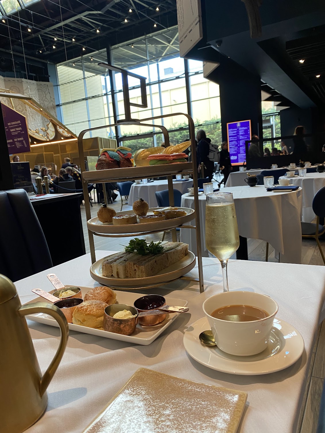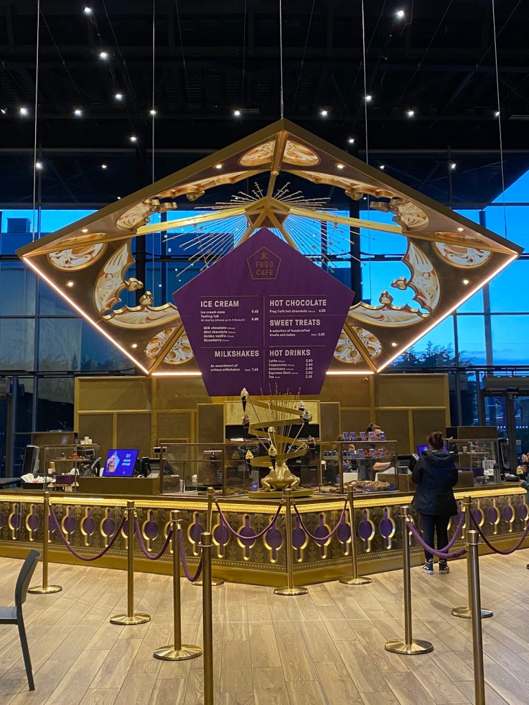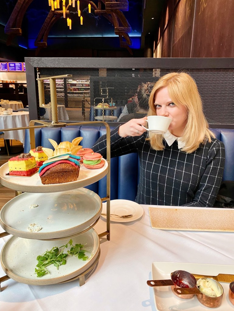 When you first walk in, it’s just as magical as you think it is going to be. They invested so much time and energy to make every part of the lobby magical. We got there early to eat at the Studios before we started the official tour. We got tickets for the Afternoon Tea and I highly recommend splurging and getting the champagne add-on! The Afternoon Tea is set up next to the food court and designed to feel like you are at a little restaurant in Hogsmeade. No detail is overlooked from the food to the cauldron of sugar cubes! I found it to be worth the money and we left very full!