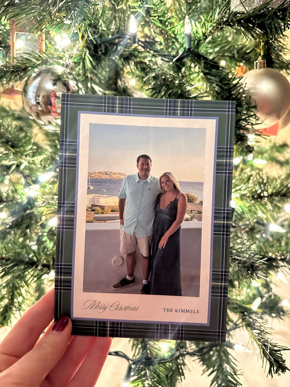 Right now, everything is digital, and we send emails and texts back and forth constantly. So this time of year, I love to send paper Christmas cards. It brings me so much joy to receive Christmas cards, so I love sending them too. This year, we ordered our Christmas cards early in November, so the hardest part of the process was deciding what picture we wanted on the card. We went with Minted again and love how they turned out! After work it’s nice to sit on the couch with Jake and write Christmas cards out to our friends and family together. I started to frame a card from each Christmas to have on display, and I love looking back at our previous years. It’s one of my favorite holiday traditions that I make time for each year, and I love having these memories to look back on year after year!