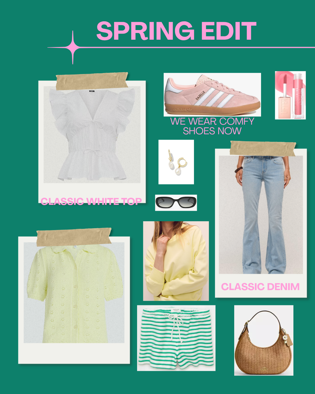 white top // pink sneakers // earrings // sunglassses // denim // lip gloss // purse // sweatshirt // stripe fleece shorts // short sleeve cardigan sweater
