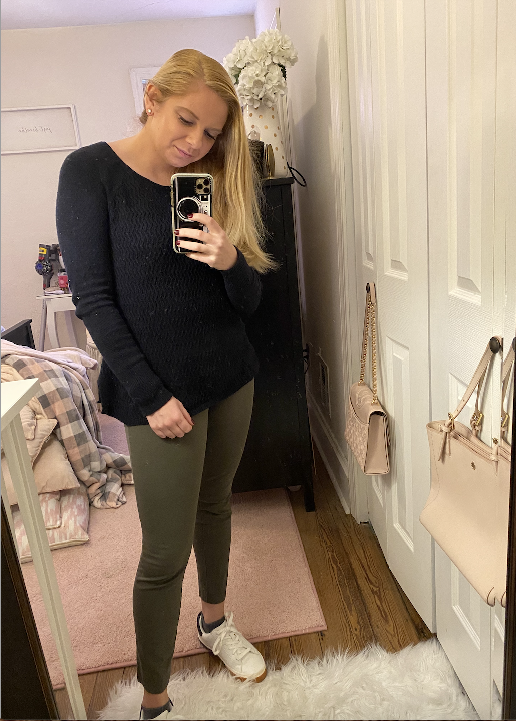 I’m a little behind on sharing my outfits on the blog because my life is been so busy lately but I’ve been loving every moment! Almost!! 🙂 I love doing this new series on the blog because it helps motivate me to create new outfits to photograph before work. After more than a year of wearing leggings and considering them to be real pants, I’m excited to shop my own closet. November feels like it flew by and I’m not sure if I’m ready for the Christmas holiday season! The day before we were driving down to North Carolina I was rushing to pack and didn’t have enough time to plan outfits so I just threw everything in a small overnight bag. When we got to my parent’s house it was clear that I didn’t really think my outfits through but luckily I packed enough sweaters to get through the weekend! We enjoyed the warmer temperatures in the South but were greeted with frigid weather when we got back! I didn’t realize I’d be wearing my big parka this early! This weekend I am taking my Christmas wardrobe out of storage so expect to see a lot of red and plaid on my Instagram this month!