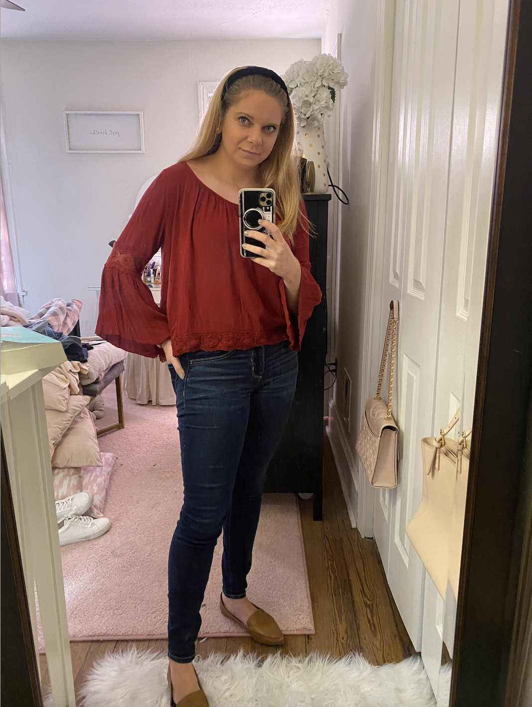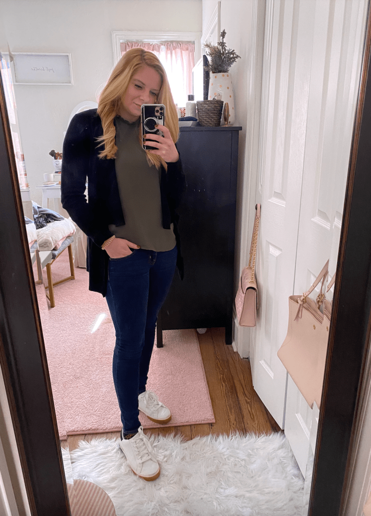 BRRRR It has been very chilly the last few days! Working from home in the morning is convenient because I can wear a cute (but old) J Crew sweater with sparkly details and slippers and no one knows! The release of RED TV felt like a national holiday so I celebrated by wearing red to work. I found this really old Hollister top in the back of my closet recently and love the fun sleeve details. Another cold day means another sweater to stay warm! I have this sweater from Loft in so many colors and I hope they bring it back because I’m always wearing it on cold days. A busy day at work before heading to school means a professional look from the waist up! I keep reaching for blouses from Loft to wear under cardigans when I have Zoom meetings. My schedule is a bit of a hybrid model with working from home in the mornings and then in the afternoon I head to school for programs. I need something cute, professional, and kid-friendly so this has been my go-to look.Another busy morning on Zoom meetings before heading to Jersey for site visits at different schools. A perk of working in schools after-school is that I can wear jeans and sneakers. I stocked up on cute white sneakers over the summer and they have been great to wear keeping up with the kids. I prefer the sneakers from Target since they are inexpensive and I don’t mind if they get destroyed during programs.
