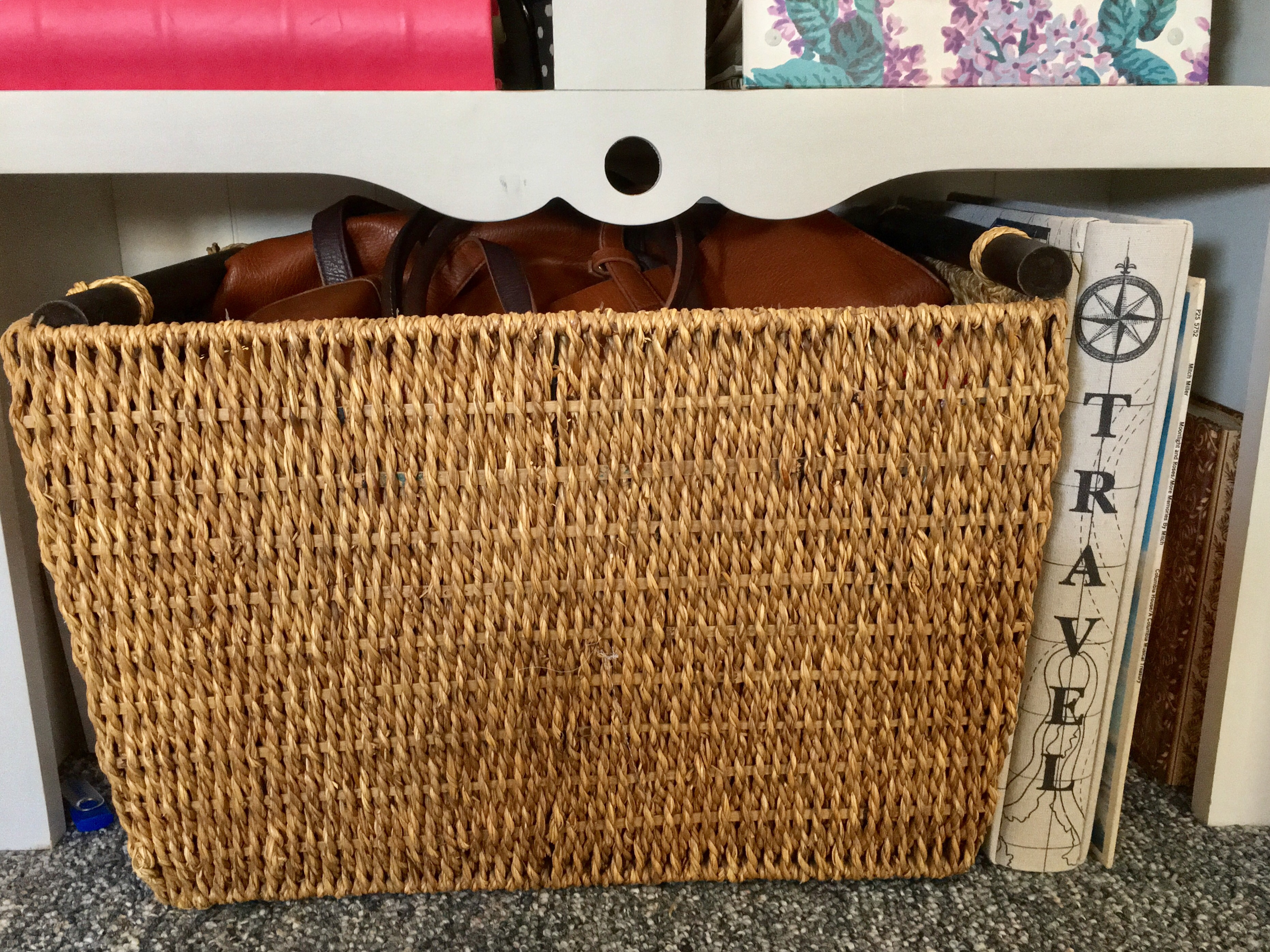 - Since I have zero space in my tiny closet, I use a basket to store all of my purses making them easy to grab but they are all stored together.