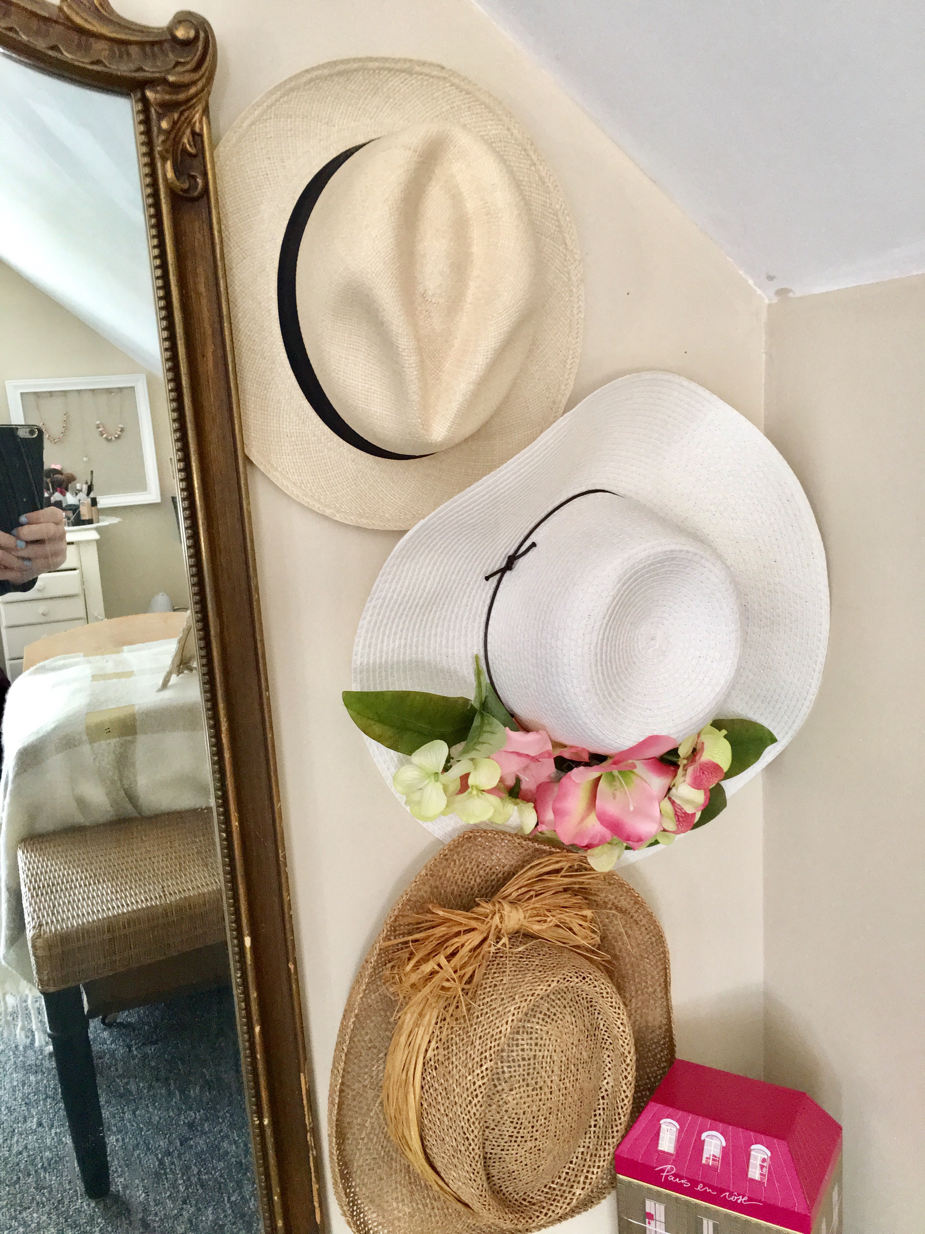 I own a lot of necklaces and wear them everyday so instead of keeping them in a drawer or a jewelry box hidden away, I like to hang them on my wall. I found both of my necklace organizers at Goodwill and they are a blessing! Instead of keeping items hidden in your closet or a drawer, be creative and find ways to display your treasured belongings. I rarely wear hats, but instead of getting crushed in my closet, with a few thumbtacks I was able to hang them and make them wall decor. With my parents in the eye business, I have accumulated a lot of sunglasses over the years. I found that the best way to store them was to put them on a tray (also a Goodwill find) on my dresser so I can easily grab a pair when I am leaving the house. Sometimes the best way to organize something is by having it out on display.