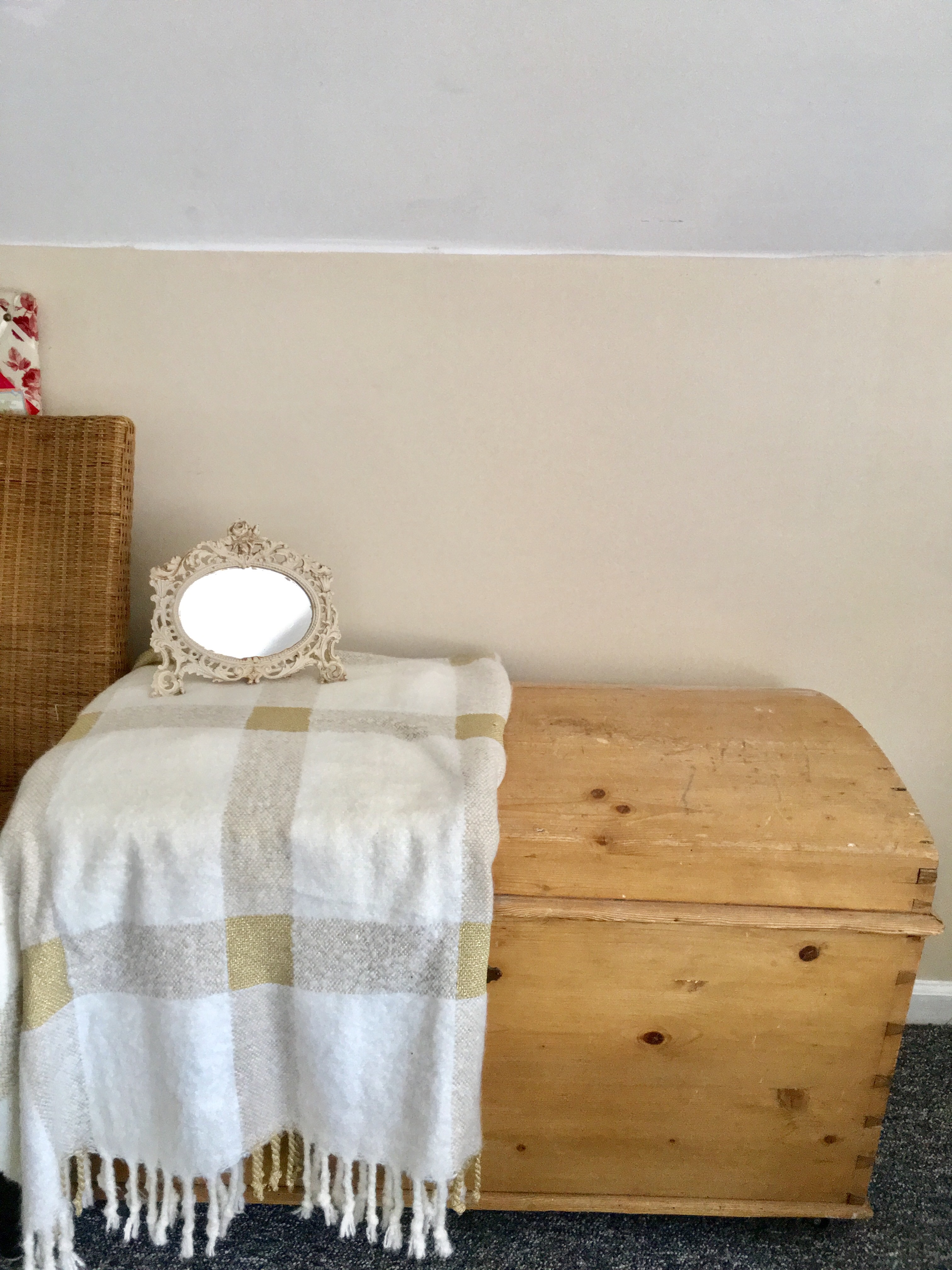 I have had this desk in my bedroom since we moved into the house more than 10 years ago, but I have my own office so I rarely used it as a desk. In the drawers there was clutter and dried up sharpies, the shelves had books and journals that looked cute but was all unnecessary. Ed helped me purge the desk and right now it is waiting to be dropped off at Goodwill in my hallway. The top portion of the desk is ideal for storage, so I took that part and turned it into a bookcase. I recently inherited a Pottery Barn trunk and I wanted to make the the most out of it. Instead of it taking up room in my bedroom I needed to make it useful. I decided for now to have it hold my off season pillows and soon it will hold my winter throw blankets.