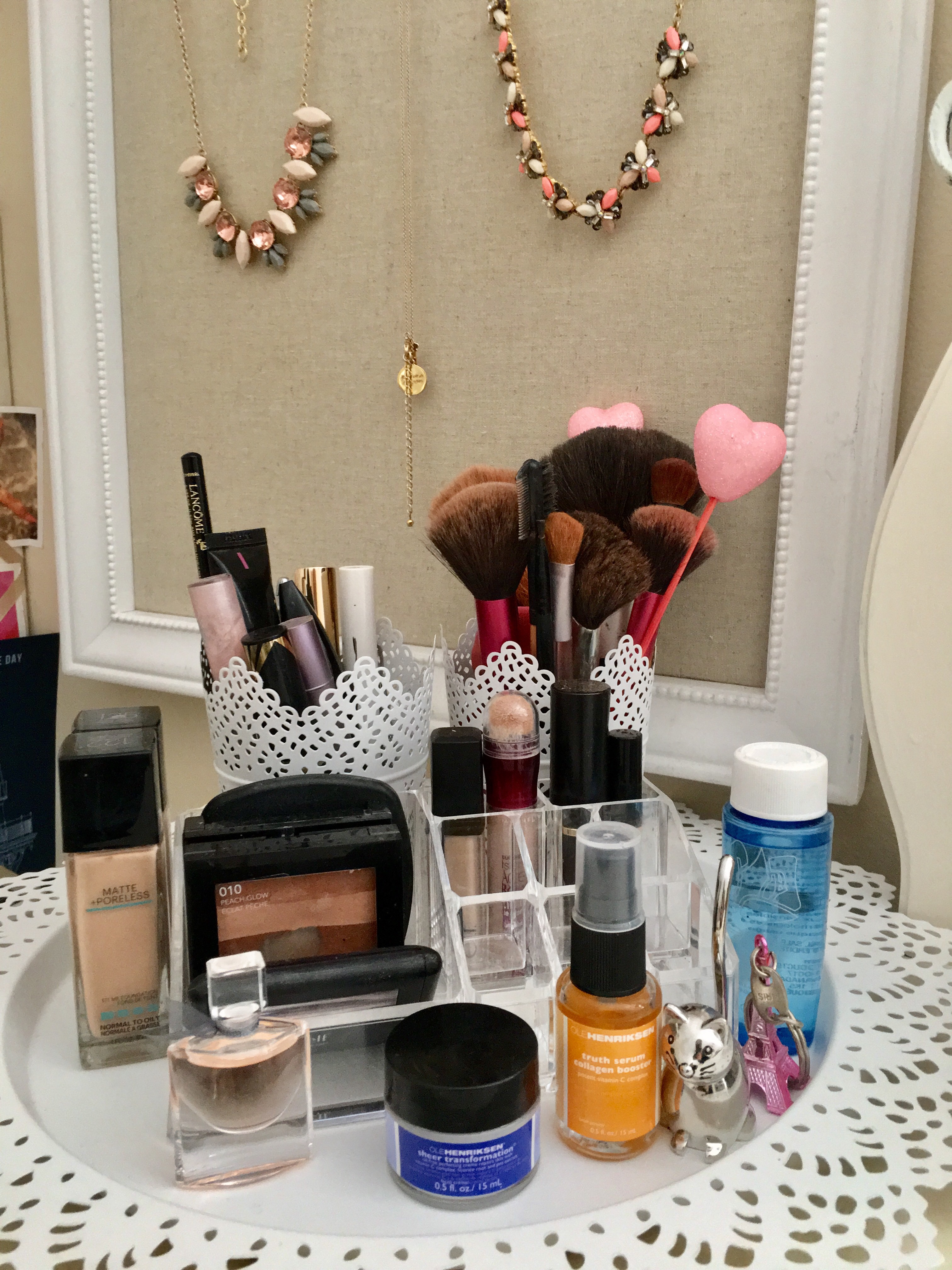 I think it started in college when my living situations had zero storage and I had to get creative. My biggest OCD is seeing clutter on surfaces. Like I can’t go to bed at night if I see stuff on my dresser that is not put away or if there are too many clothes on the chair in my room. With that being said, in college I only had a wardrobe, a desk and a small bedside table to store things making me find ways to get creative. I started to use pretty canisters to store things like nail polishes, makeup tools and other items.