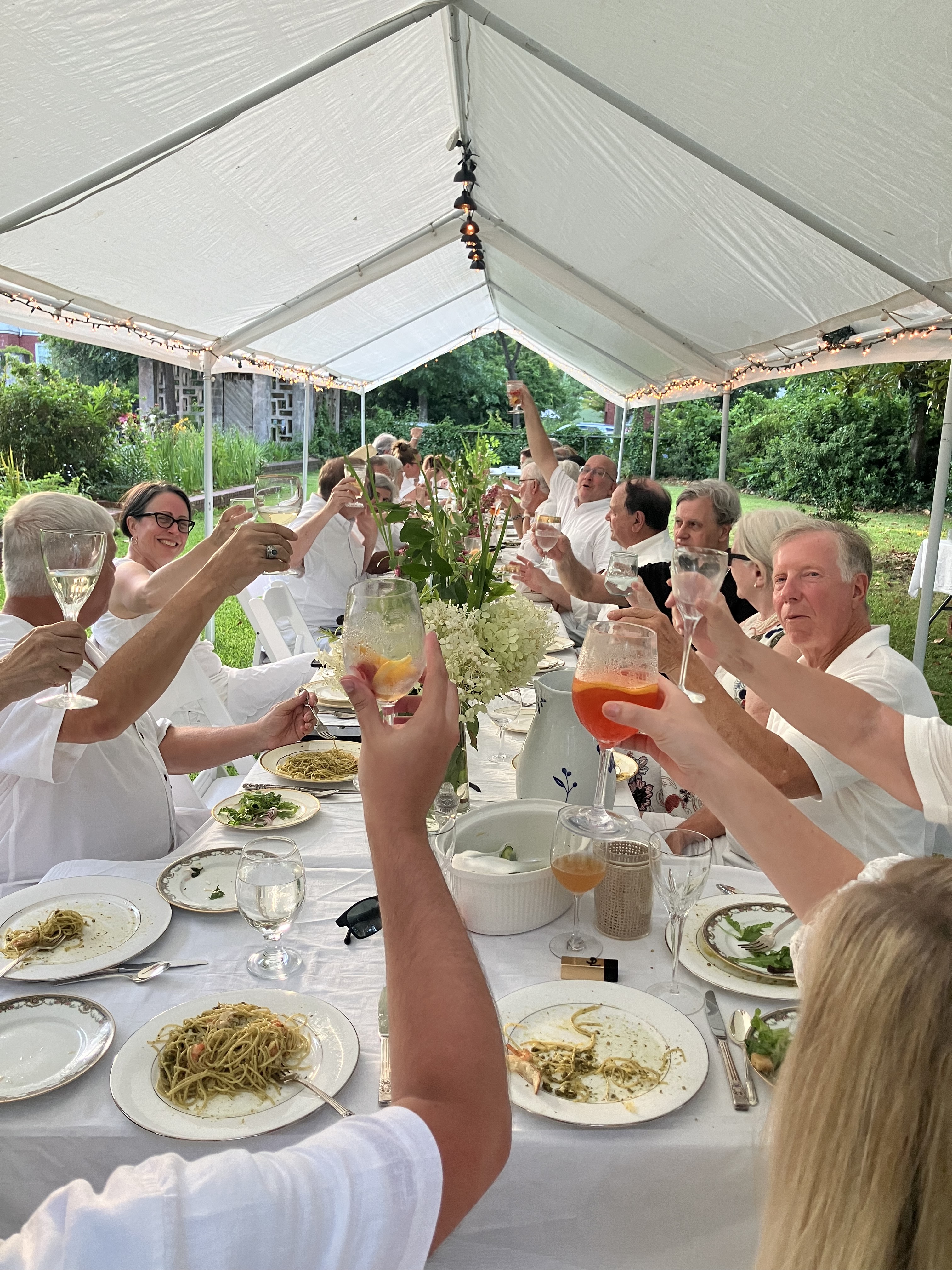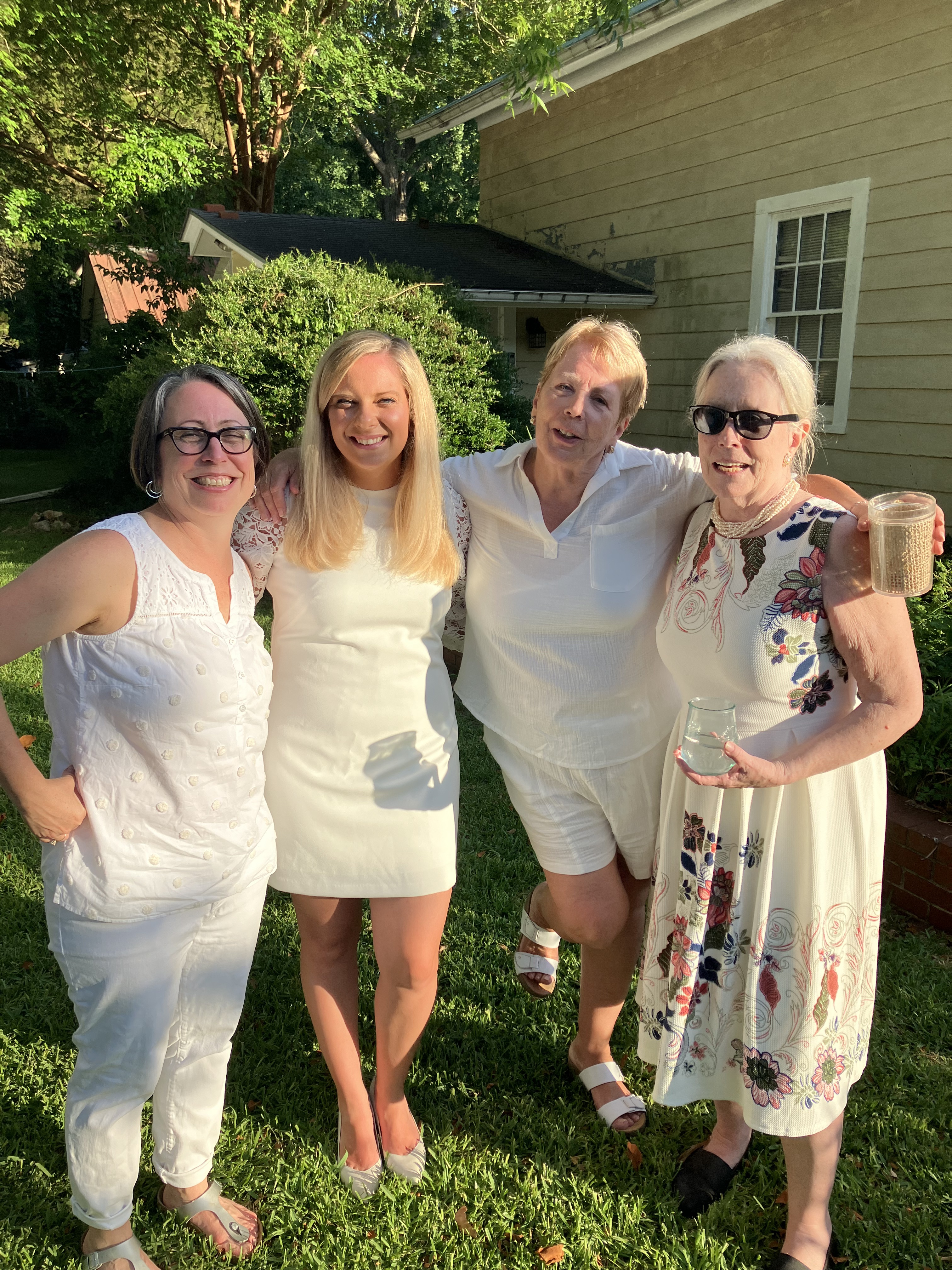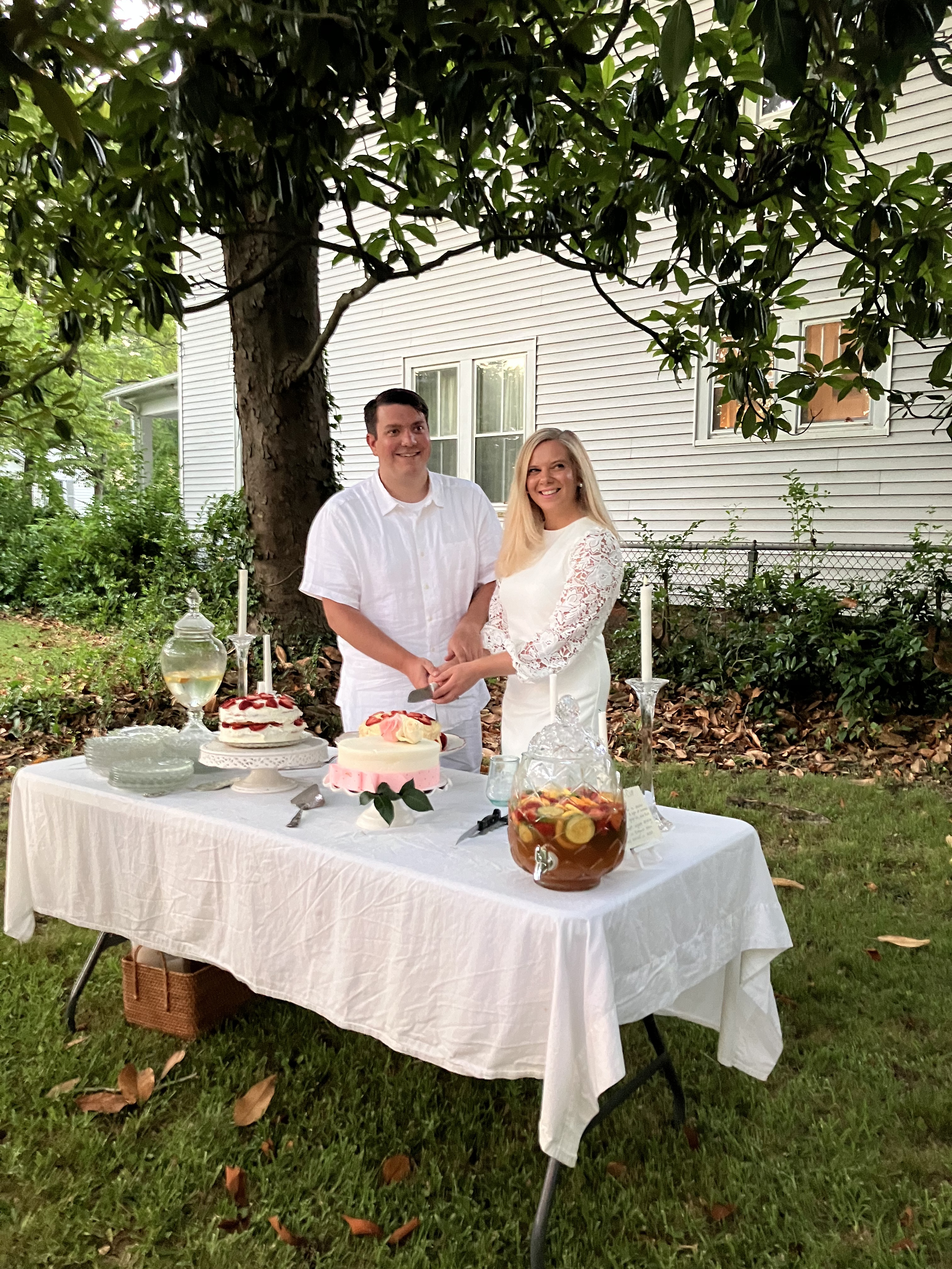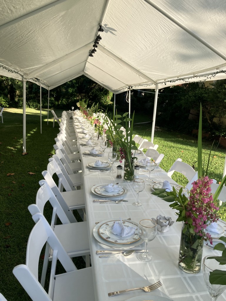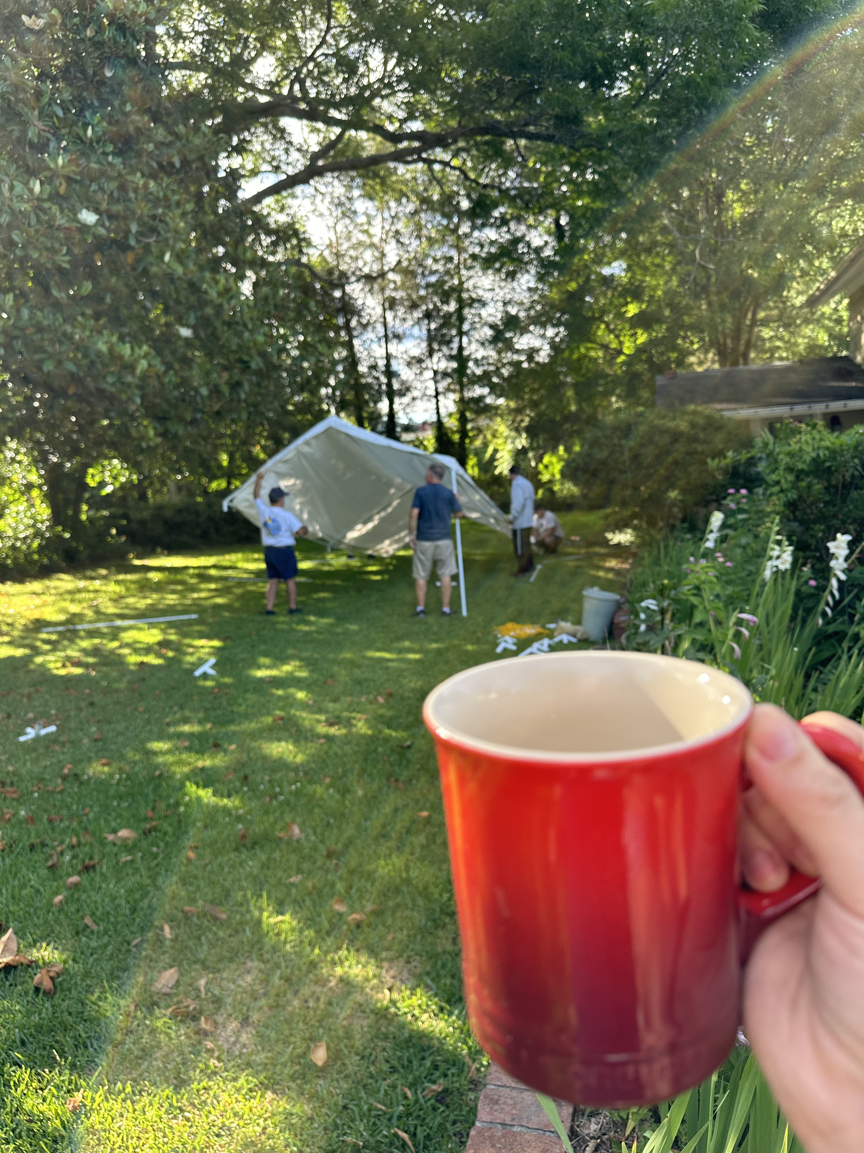 Our original plan was to drive to my parents’ house on that Friday to be there for the party on Saturday, so my parents were still in cleaning and planning mode when we got there. I saw with my own eyes that this small party with her friends had turned into an event. Did you ever watch Downton Abbey or Bridgerton and see the servants running around the days before to prepare the flowers, the China, and the food? Well, my parents’ house was like that without the Mr. Carson and other servants there to do the work. My mom handmade invitations to her White Party where guests are instructed to wear white. She also hand-delivered each one to 50 of her friends in the neighborhood to invite them to the party. On Friday morning before 8AM, I drank my cup of coffee out of a Le Creuset coffee mug and watched as different parts of the party prep came together like a rehearsed dance with the choreography. At 7AM, a large tent went up in my parent’s side yard, and when the tent was just finished being assembled, the landscapers came to mow the grass just in time before the chair rental delivery was coming to drop off 50 chairs. This was all choreographed so well because a party for 50 people is considered a small get-together for my parent’s as they often entertain people in the hundreds in their backyard. As Jake and I watched the comings and goings of tent assembly, landscapers on their mowers mowing the large lawn and my dad on the phone with the chair rental company, Jake leaned in and whispered “ I sometimes forget you come from this world”. He didn’t mean it as anything negative, but my parents have always entertained in their home, and growing up meant I was there to assist and play hostess. It’s one of the things I look forward to when we get married. I can’t wait to be able to host parties and get-togethers with friends and family at our house like my parents did growing up.