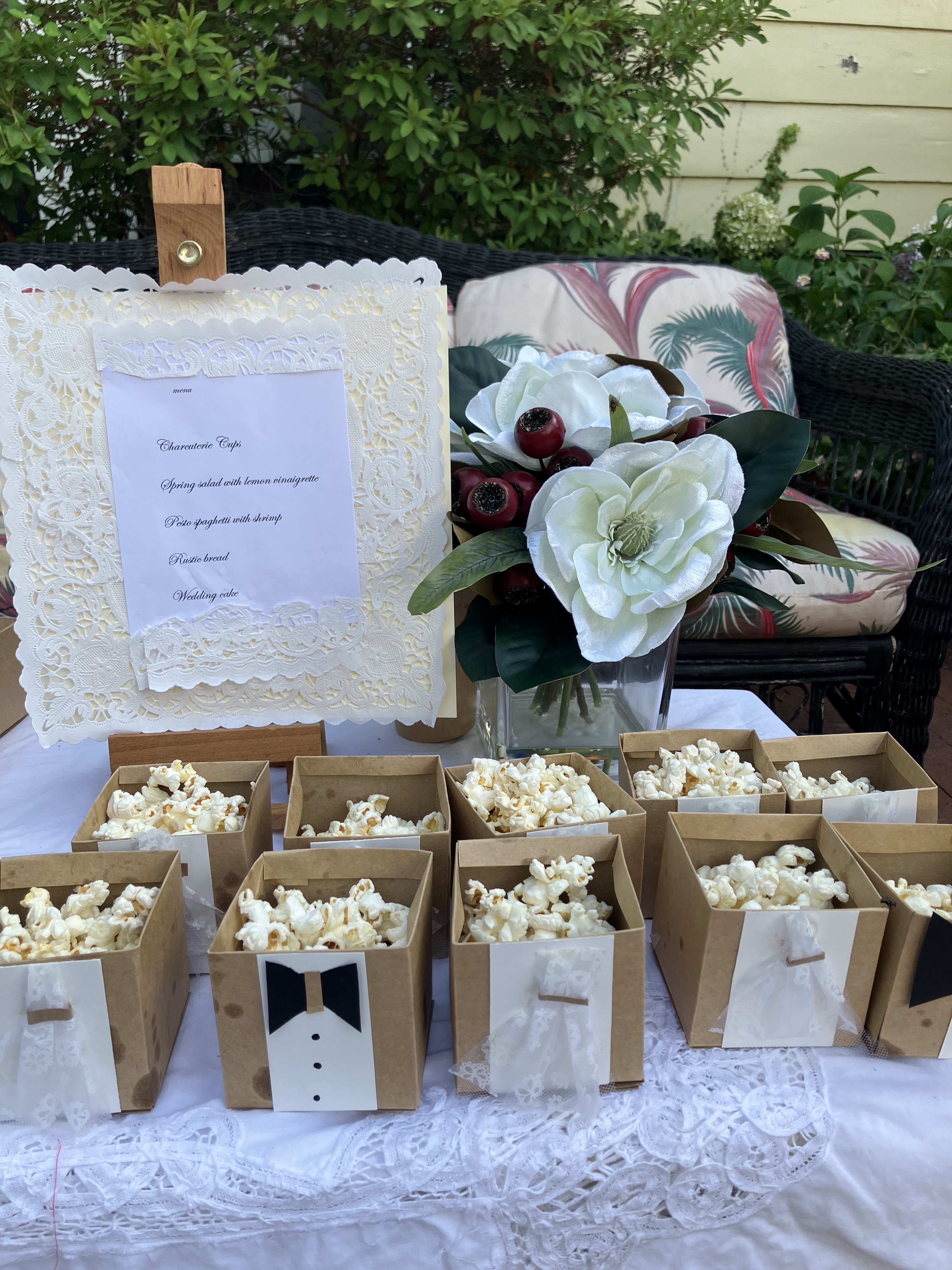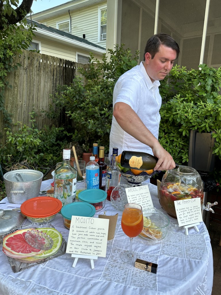 “So, I heard you’re getting married in a castle!” The party had already started when I walked out back, and the guests had drinks in their hands. A group of women came up to me to wish me congratulations and started asking questions about the wedding. These questions they already knew the answers to because my mom had been sharing our wedding details with her friends who were in awe. My mom saw me in the crowd and took me by the arm to introduce the Bride To Be to the guests. Jake and I earlier had volunteered to bartend, so we went out and got ingredients to make 3 signature drinks that were special to us: Pimms, Aperol Spritz, and Mojitos. Jake was sweaty behind the bar making drinks but saw me whisper “APEROL” and he nodded to let me know he heard loud and clear.